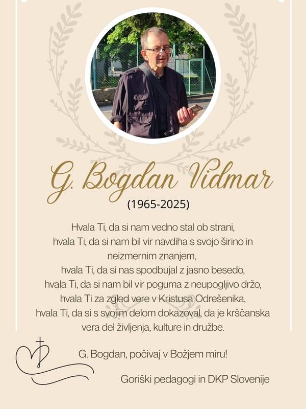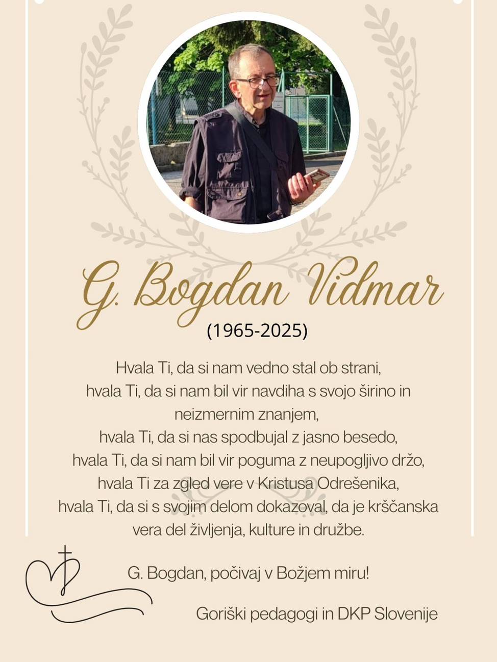 Pretresla me je vest, da je umrl g. Bogdan Vidmar. Spoznala sem ga v zadnjem času, preko Društva katoliških pedagogov Slovenije. Občudovala sem njegovo delavnost ter zavzetost za Evropsko leto kulture in povezanost obeh Goric.