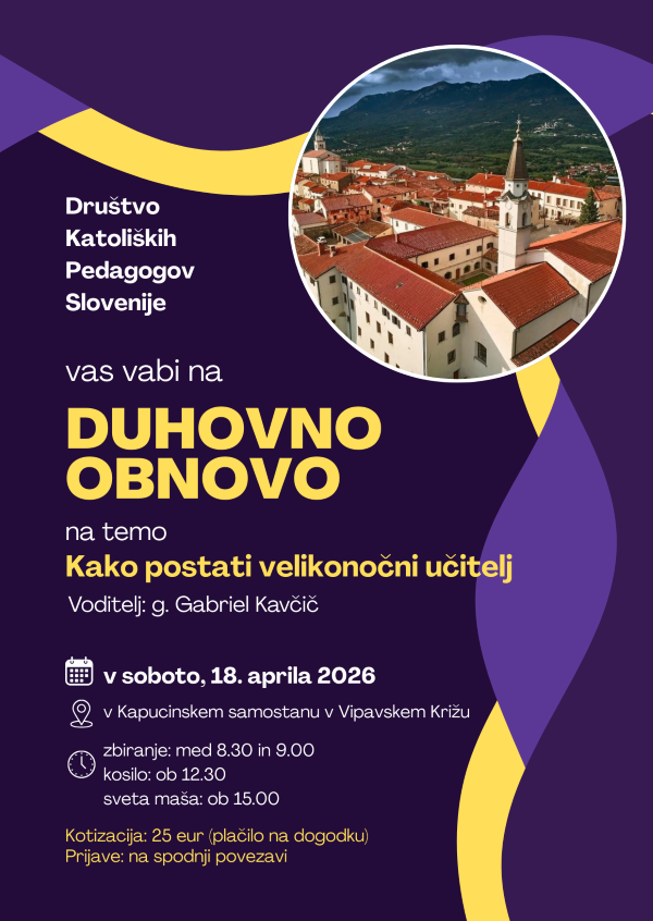 V soboto, 5. aprila, je v Novi Gorici potekalo vseslovensko študijsko srečanje pedagogov z naslovom »Sodobni učitelj in večna pedagoška vprašanja. Pobudnik srečanja je bilo Društvo katoliških pedagogov Slovenije, glavno organizacijo pa so nato prevzeli goriški pedagogi. Zasledovali in dosegli smo več ciljev. Najprej smo preko druženja in pogovora okrepili občutek povezanosti. Poleg tega smo se obogatili za marsikatero novo spoznanje, ko smo prisluhnili trem predavateljem: Janu Dominiku Bogataju, Anji Božič in Nadji Ušaj Pregeljc. Z ogledom samostanske knjižnice in grobnice Bourbonov na Kostanjevici smo se vključili v živahno kulturno dogajanje evropske prestolnice kulture. Ne nazadnje, nam je srečanje pomenilo vir novih duhovnih moči in upanja, saj smo skupaj praznovali sveto mašo in se priporočili zavetniku učiteljev, bl. Antonu Martinu Slomšku, ob tem ko so slovesno umestili njegove relikvije v novogoriški konkatedrali. Iskreno smo hvaležni vsem gostom, ki so s svojim odzivom na vabilo izkazali veliko spoštovanje in zaupanje do našega pedagoškega poklica - predsedniku DS RS, g. Marku Lotriču, akademskemu profesorju Milčku Komelju, in, seveda, škofu Juriju Bizjaku. Hvala gostiteljici - župniji Kristusa Odrešenika. In hvala udeležencem, ki so prepoznali pomembnost dogodka in si zanj vzeli čas. |