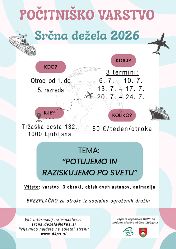 Za več informacij nam lahko pišete na e-naslov srcna.dezela@dkps.si. Izvedbo počitniškega varstva podpira in sofinancira Mestna občina Ljubljana.