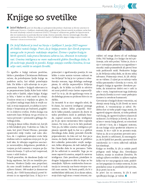 V rubriki Vzgojni načrt Octavian M. Machidon nadaljuje serijo člankov o umetni inteligenci in razkrije poglede na dejstva, kako lahko zaradi nepremišljene rabe umetne inteligence, otrok namesto dar postane projekt. Silvo Šinkovec se naveže na razmišljanje iz prejšnje številke Vzgoje in se posveti značaju ljudem iz Cankarjevega romana Na klancu.