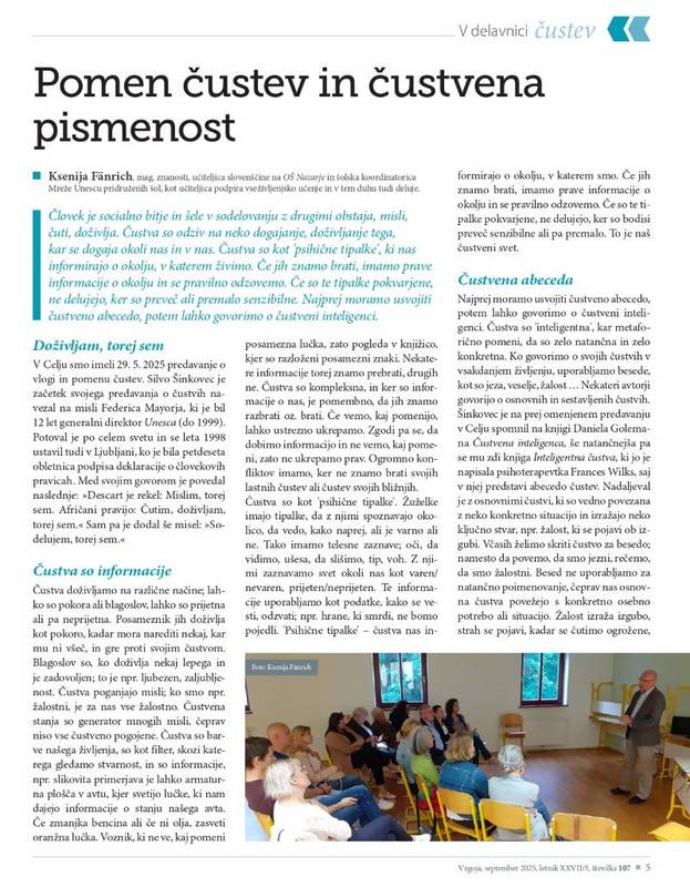 Z novinarko s. Meto Potočnik se je pogovarjala ena od avtoric prispevkov, prof. Jana Ozimek. Avtorica predstavlja svoj pogled v čustveni svet človeka skozi poučevanje in literaturo.